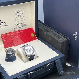 Iconico Omega Speedmaster “Silver Snoopy Award”, una delle edizioni più apprezzate e ricercate della collezione Moonwatch. Esemplare del 2021, cinturino in tessuto blu e celebre fondello animato con Snoopy in orbita, tributo al prestigioso premio NASA del 1970. Movimento manuale Omega calibro 3861 certificato Master Chronometer.