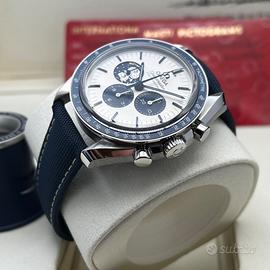 Iconico Omega Speedmaster “Silver Snoopy Award”, una delle edizioni più apprezzate e ricercate della collezione Moonwatch. Esemplare del 2025, cinturino in tessuto blu e celebre fondello animato con Snoopy in orbita, tributo al prestigioso premio NASA del 1970. Movimento manuale Omega calibro 3861 certificato Master Chronometer.