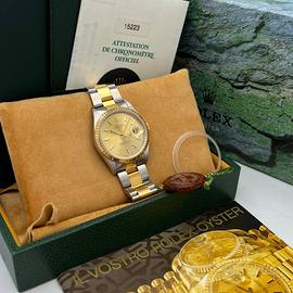 Rolex Oyster Perpetual Date 34 mm, referenza 15223, in acciaio e oro giallo 18k (Rolesor), con lunetta zigrinata in oro, quadrante champagne e bracciale Oyster. Alimentato dal movimento automatico Rolex calibro 3135, garanzia di precisione e affidabilitĂ . Un modello classico e raffinato, simbolo dello stile senza tempo di Rolex.