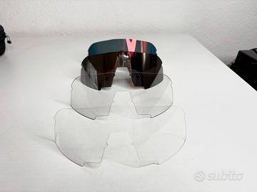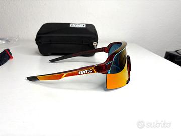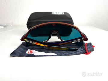 Occhiali da sole 100 percent, fornito con una custodia rigida, un sacchetto di pulizia in microfibra, 3 lente di ricambio (1 già con la montatura) -Lenti intercambiabili antigraffio -Lente di protezione cilindrica con base 5,5 per una maggiore visione periferica e protezione -Visibilità a 360° per una visuale libera e un campo visivo ottimale -Montatura TR90 resistente, flessibile e leggera -Il nasello e le punte delle tempie in gomma ultra-aderente garantiscono una vestibilità sicura indipendentemente da quanto sudi -Lenti in policarbonato leggero e resistente agli urti -Prese d'aria inferiori per aumentare la ventilazione riducendo l'umidità sulla lente -Il trattamento delle lenti idrofobico e oleofobico respinge acqua, sporco e olio