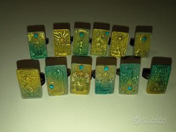 12 anelli gioco carte tarocchi dimensione 220 x 140 mm. In resina fatti a mano e 2 anelli squame di pesce diametro 1 cm. Euro 40,00 tutto il lotto, Ritiro di persona o spese di spedizione a parte