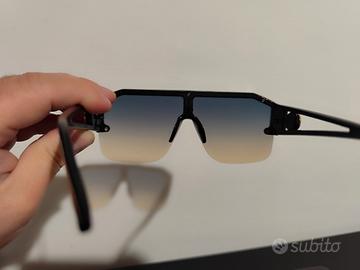 Occhiali da sole con montatura nera e lenti azzurre.