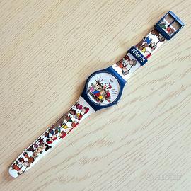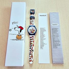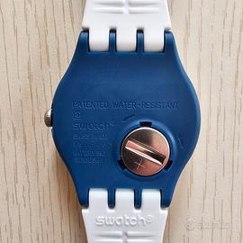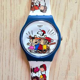 Questo orologio Swatch X Peanuts è dotato di una cassa blu scuro opaca in materiale biologico a contrasto con il cinturino in silicone bianco opaco con stampa.