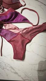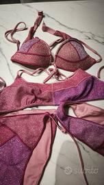 2 Costumi Calzedonia rosa e viola. Effetto molto luminoso. Mutanda con lacci taglia 3 regolabile mai indossata. Reggiseno Taglia 2 a fasce con cartellino, reggiseno Taglia 3 usato ma in ottime condizioni. Brasiliana taglia L usato ma in ottime condizioni.