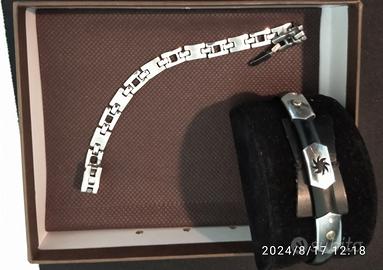 Coppia di Braccialetti uomo, uno mod. INCAS in acciaio inox rodiato e uno mod. EGYPT in caucciù siliconico, piastrine inox con simbolo Sole e 2 punti placati oro, entrambi di lunghezza 21,5 cm… lucidi ed eleganti, adatti su qualsiasi abbigliamento, custodia, scatola.