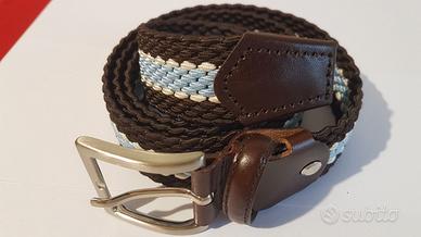 Due cinture uomo in tessuto elasticizzato, con parti in vera pelle, altezza cm. 3,5. La prima con la parte esterna beige è misura 54 (105/120); la seconda con la parte esterna marrone è misura 52 (100/115). Made in Italy. Mai usate, perfette condizioni.