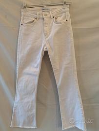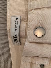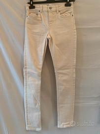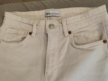 Jeans colore panna, modello classico 5 tasche, gamba dritta Jeans bianco, modello classico 5 tasche, gamba leggermente a campana, sfrangiato Tutti e due in cotone elasticizzato Tittie due misurano in vita 34 cm Lunghezza 95 cm Condizioni perfette Tutti e due 5€