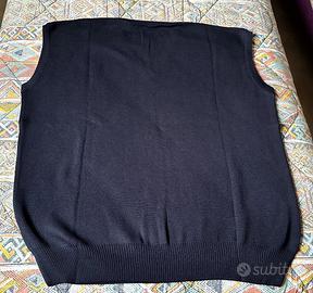 Uno smanicato blu scuro con scollo a V, taglia 62, 50% lana vergine e 50% acrilico, Made in Italy.
