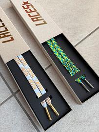 2 paia di lacci originali Golden Goose. Misura 110cm Un paio in cotone di colore nero, blu, giallo e scritta nera a contrasto. Un paio di colore bianco con scritta Laces oro a contrasto. Nuovi in confezione originale