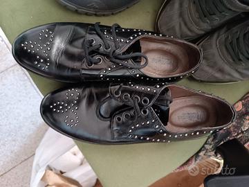 1 paio scarpe con borchie tre disegnate num. 37. 5€ donna usate, scarpe da ginnastica grigie num. 38 usate,5€. scarponcini 40 -41. 5€