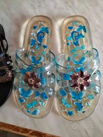 2 paia zoccoli, gli infradito neri sono Gioseppo e i trasparenti sono per mare. Infradito n. 37 e i trasparenti sono n. 40, ma calzano 37. Si possono vendere pure separatamente. Usato ma in stato discreto