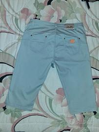 Blocco di 2 paia di Pantaloni Donna tipo Jeans in Cotone, Modello Capri / Pinocchietti, lunghezza al ginocchio. In Tessuto leggero e fresco: ideali per Primavera, Estate e Autunno. Pratici e comodissimi. Taglie Comode Curvy elasticizzate: XL 48/50. Tessuto elasticizzato in Cotone, con aggiunta di Elastan. Il modello è uguale per tutti e 2 i Pantaloni, cambia solo il colore. Entrambi a vita medio-bassa con allacciatura in vita con bottone e cerniera. Con passanti in vita per cintura e 4 tasche, 2 laterali davanti e 2 dietro. Colori: Azzurro chiaro e Beige. Articoli rigorosamente Made in Italy. - Pantalone azzurro chiaro tipo Jeans: Marca Max & Liu. Taglia XL-48. Tessuto: 67% Cotone, 31% Poliestere, 2% Elastan. Il tessuto è leggermente lucido e dà un effetto satinato. Con spacchetti laterali a fondo gamba arricchiti da borchiette decorative con brillantino. - Pantalone Beige: Marca Emmeci Maggio. Taglia 50 Italiana. Tessuto: 95% Cotone, 5% Elastan. Le taglie indicate sono diverse, ma trattasi di Taglia Comoda / Curvy, vestono tutti e 2 similmente, ovvero una Taglia 48/50 ed inoltre sono molto elasticizzati. Articoli nuovi, perfetti, nessun difetto. Lavati, stirati e sanificati. N.B.: Articoli venduti in blocco. Non si separa, no richieste singole.