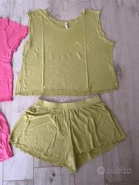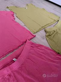 Set di due pigiami estivi, uno rosa e uno verde, la maglia di quello rosa ha le maniche corte, quello verde invece è a canotta. Tessuto morbido, confortevole e leggerissimo. Design con bordi ondulati. In ottime condizioni, quello verde ha una macchia sulla parte anteriore dovuta all’uso di candeggina. Vendo insieme (4€) o separatamente (2€ ciascuno)