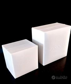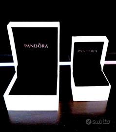 Eleganti scatole originali Pandora in cartoncino rigido rivestito, colore bianco perlato con logo Pandora impresso sul coperchio e interno in velluto nero.
