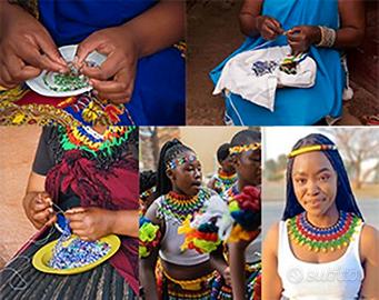 le donne zulu si siedono e infilano ogni minuscola perlina in una collana di design. possono impiegare 3\4 giorni per completare una collana. Ogni pezzo è un'opera d'arte.