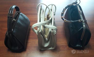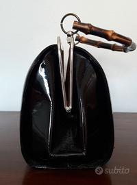 - in pelle nera lucida con manico in bambù. Lievi screpolature della vernice nelle curve della pelle ai lati (vedi foto). (60€)