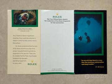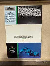 Il testo è una brochure pubblicitaria della Rolex che promuove i modelli di orologi Submariner e Sea-Dweller, paragonandoli al delfino maculato del Pacifico per la loro capacità di adattarsi all'ambiente marino.