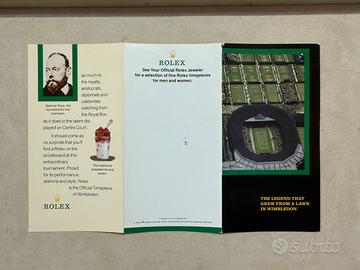 Questo opuscolo Rolex promozionale descrive la partnership di lunga data del marchio con il torneo di tennis di Wimbledon, evidenziando il ruolo di Rolex come cronometro ufficiale e celebrando la storia e la tradizione dell'evento.