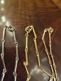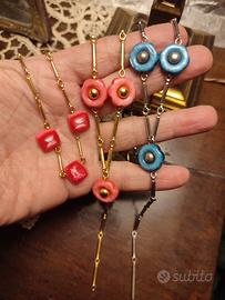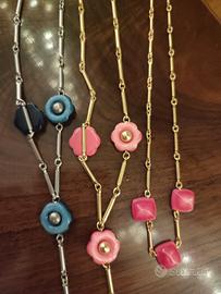set di 3 collanine anni 70 in metallo con inserti in lucite. condizioni pari al nuovo. a quella con i fiori rosa manca l'ultimo segmento ma è possibile terminarla con un piccolo pendente. possibile ritiro in zona piazza Loreto Milano