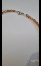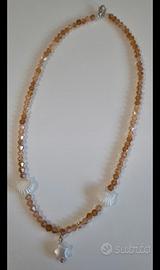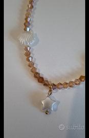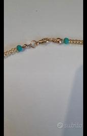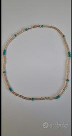3 collanine di perline. Una con perline dorate e verde acqua, una con perline dorate di due gradazioni diverse con perline bianche a forma di conchiglia e stella e l'altra con perline argentate e azzurre.