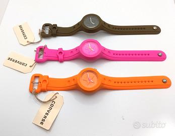 3 orologi mai indossati marca CONVERSE modello ROOKIE, colori neon orange---neon pink---drab green--, cassa in acciaio inossidabile 43 mm. con fondello a vite, cinturino monopezzo in silicone con chiusura ad ardiglione, movimento di precisione Japan al quarzo, water resistant 50 mt. lancette ore e minuti luminescenti, lancetta secondi colorata, orologi uomo donna unisex, completi di etichette, mancanti di confezione, batterie nuove, orologi perfettamente funzionanti, spedizione tracciabile.