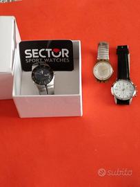 vendo 3 orologi : 1° Sector donna solo tempo a batteria, nuovo, regalo mai indossato, diametro cm32, modello 880, completo di scatola originale. 2° Swatch vecchio modello del 1998, funzionante, presenta delle rotture esterne laddove vi è l'attacco del cinturino da ambo i lati. 3° orologio usato , funzionante, produzione cinese, i tasti piccoli non regolano nulla, solo per estetica. Lo Swatch e Geneva senza scatola.