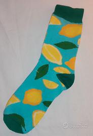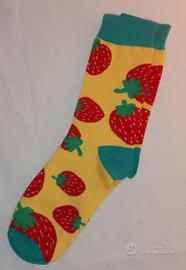Set di tre paia di calzini con fantasie di frutta assortite. - Calzini con stampa di limoni su sfondo azzurro. - Calzini con fantasia anguria. - Calzini con stampa di fragole su sfondo giallo. - Possono essere usati anche da ragazzi o uomini.
