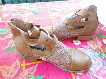 Esattamente come da foto, praticamente nuove, mai indossate, calzatura donna, originale Silvia Sikel, misura 38, scarponcini stivaletti estivi, in vera pelle e pizzo macramè, colore caffè latte.