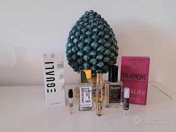 4 PROFUMI DI NICCHIA UNISEX (4 ISPIRAZIONI) TOM FORD – SOLEIL BLANC (EGUALI) 100 ml AMOUAGE – PORTRAYAL MAN (SHOBI) 30 ml MONTALE – STARRY NIGHTS (ROYAL LIFE) 50 ml OJAR – INFUSION VELOURS (MEDESIMO) 50 ml (OMAGGI ELDO – ARCHIVES 69 MANCERA – INDIAN DREAM, SIMONE ANDREOLI – SMOKE OF DESERT) SVENDO PER RINNOVO PROFUMI DELLA MIA COLLEZIONE (ALCUNI PIENI O CON POCHI ML EROGATI. VEDI FOTO) TRATTATI MANIACALMENTE AL BUIO E A TEMPERATURE IDONEE. I PROFUMI SONO DI ALTISSIMA QUALITÀ, PERSISTENZA, SOMIGLIANZA (DISPOSTO A SCAMBI) Tom Ford Soleil Blanc è una inebriante ambra solare floreale ravvivata da una seducente raffinatezza, che brama impunemente l’infinita ricerca del sole. Testa: Pistacchio, Bergamotto, Cardamomo e Pepe Rosa; Cuore: Tuberosa, Ylang Ylang e Gelsomino; Fondo: Cocco, Ambra, Fava Tonka e Benzoino. Montale Starry Nights, luminoso come una stella, il Bergamotto Calabrese si irraggia su un cuore floreale nel quale la Rosa Bulgara, riscaldata dalle note orientali del Patchouli di, si mescola con il Gelsomino Egiziano creando una scia di sulla pelle sensuale con note talcate. Amouage Potrayal Man trasmette la sensazione di avventura e di sregolatezza tipica degli Anni 20, avvolgendo chi lo indossa in un'atmosfera di eleganza e di raffinatezza unica. Testa: Foglie di Violetta. Cuore: Vetiver. Fondo: Cade. Ojar Infusion Velours, è un profumo orientale ambrato fruttato incentrato sul prezioso olio di Oud. Infusion Velours si ispira al velluto. Opulento e ricco, se dovessimo dargli un colore sarebbe il viola. Un accordo di Oud e frutti rossi che rende questa fragranza meravigliosamente intensa e sensuale. Testa: Pepe Nero, Cannella, Mora. Cuore: Lampone, Legno di Agar, Legno di Cedro. Fondo: Legno di Agar, Patchouly, Incenso.
