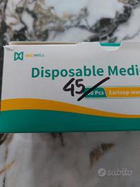 Scatola con 45 mascherine chirurgiche 17x9.5 colore azzurro con elastici. Uso singolo. Marca Medwell.