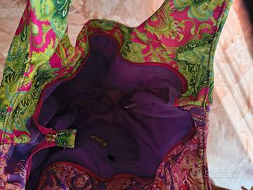borsa tote 4Giveness mai usata con sua custodia con stampa paisley rosa verde e viola