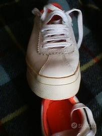 5 scarpe nn. 35,36,37,38 + stivali regalo > ALTRE FOTO disponibili < 1) VERA PELLE n.37 morbido mocassino marca "Vainer" senza stringhe con due piccole fascette elastiche laterali. Colore "somalo amber" (marrone medio).Suola in vera gomma, marca Maori made in Italy- Come nuove: interno, esterno e suola perfetti. eur 55 tratt. PIU' in REGALO STIVALI, neri n.38 : Doppia cerniera. Punta rinforzata. Decorazioni matalliche. Usati pochissime volte, parte della "scarpa" ottima, MA sono stati malriposti, con piegature che hanno generato alcune spellature superficiali sul gambale, adatti ad essere indossati con i pantaloni. ..................................... 2) mocassino n.38 tacco 3 cm ."Q.Passi", no stringhe. Decorazione a fronte: allaccio e 2 brillantini. NUOVO, similpelle bicolore marrone medio con rifiniture e retro in marrone chiaro. eur 25 tratt. ..................................... 3) scarpe n.36 suola carroarmato (cm 1,5) tacco 7 cm. "Fiori e Spine" NUOVE, similpelle colore nero. eur 30 tratt. ..................................... 4) Sneaker n.36 marca SUPERGA "Superga Fashion Sneaker" in PELLE stampata effetto coccodrillo, interno in LINO (non è il modello in sintetico). Fondo platform alto 4 cm. Suola vera gomma, classica a grani. colore: marrone scuro, bordo piattaforma bianco. Indossate ca. 4 volte. Perfette. eur 45 tratt. ( il nuovo è a 120 ) ..................................... 5) "Superga Sport Sneaker" n.35, tomaia in morbida pelle aereata microfori. Fondo platform alto 3,5 cm. Scuola a cassetta in gomma naturale vulcanizzata. colore: bianco avorio, con rinforzi in rosa fluo. Indossate 2 o 3 volte, praticamente come nuove. Perfette. eur 45 tratt. ( il nuovo è a 120 ) -------------------------------------- >> ALTRE FOTO disponibili << Possibili abbinamenti e sconti con acquisti multipli anche sugli altri miei annunci. Per esempio: SCONTO "3 x 2" Visione e consegna gratuita in Torino, oppure spedizione.
