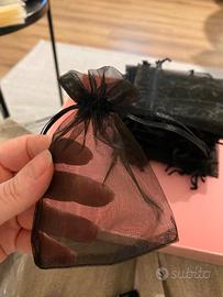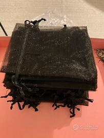 Vendo 50 sacchetti in tessuto nero con chiusura a coulisse, perfetti per bijoux, orecchini, braccialetti, piccoli regali o packaging elegante.