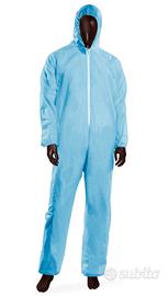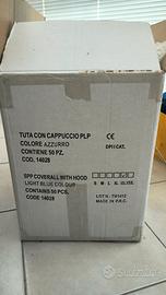 Scatolo da nr. 50 tute monouso AJSIA in PLP con cappuccio taglia XXL colore azzurro (codice articolo 14028 HOOD 40), peso 40 gr/m2, elastico al cappuccio, ai polsi e alle caviglie, chiusura con cerniera. Indumento destinato al personale impiegato in attività del settore alimentare e pulizia industriale. TUTTE LE TUTE ANCORA IMBUSTATE