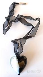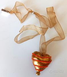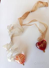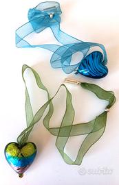 Set composto da 6 pendenti artigianali in vetro di Murano, ciascuno caratterizzato da un cuore in vetro sospeso. 👉 Dimensione dei cuori in vetro cm. 3 x 3 👉 Alcuni cuori presentano dettagli in foglia oro, che donano luminosità ed eleganza al gioiello. Ogni pendente è montato su un nastro di organza largo circa 1 cm, utilizzato come girocollo, con chiusura finale in ottone decorativo. Oggetti raffinati, ideali come idea regalo originale oppure come accessorio elegante e distintivo. Ogni pezzo ha un design unico tipico della lavorazione artigianale del vetro. CONDIZIONI: visto e piaciuto come in foto.