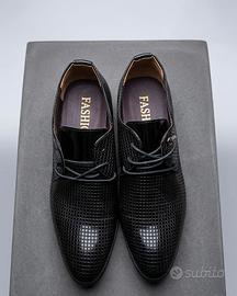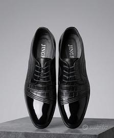 Vendo lotto di 7 paia di scarpe eleganti da uomo, ideali per occasioni formali, cerimonie o uso quotidiano in ufficio. Il lotto comprende: • 1 paio oxford in vernice blu elettrico con lacci grigi • 2 paia derby nere con dettagli in rilievo (coccodrillo/serpente) e punta in vernice – brand Jingpi • 1 paio derby nere con tomaia a quadretti in rilievo – brand Fashion • 1 paio oxford nere in vernice liscia con interno rosso • 1 paio derby nere con texture a righe orizzontali – brand Jingpi • 1 paio derby nere in vernice con tomaia a griglia fine – brand Fashion Tutte in ottime condizioni, stile moderno e raffinato.