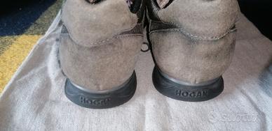 Esattamente come da foto, in buone condizioni estetiche, calzature originali Hogan sportive basse, stringate, in pelle scamosciata e tessuto traspirante, con logo "H" in metallo.