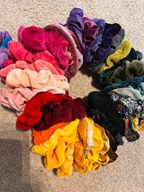 Vasta collezione di elastici per capelli in velluto, noti come "scrunchies"