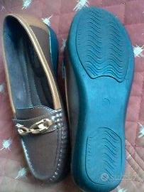 3) mocassino n.38 tacco 3 cm ."Q.Passi", no stringhe. Falso allaccio e 2 brillantini Similpelle bicolore marrone medio e chiaro
