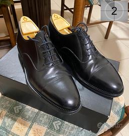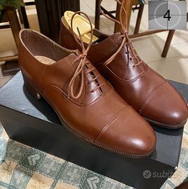 Scarpe in vera pelle, nere o marrone/brandy, con lacci, fodera interna in pelle. Sottopiede, suola e tacco in vero cuoio, con antiscivolo gomma. Materiale e manodopera italiana, qualità e comodità di prima scelta. Con tendiscarpe. Misure 40.