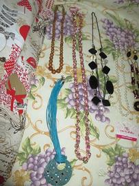 Nr. 7 collane varie: 1 tipo ambra, 1 con medaglione turchese, 1 catena con nastro fucsia, 1 con pietre nere e trasparenti, 1 con maglie dorate, nere e bordeaux, 1 con nastro color salmone e un grande ciondolo in madreperla, 1 molto lunga con grossi coralli neri e color oro antico (E 3,50 cad.), 1 completo formato da una collana + 1 bracciale tipo perle (E3,50 il completo). Disponibili, per cambio guardaroba, altri bijoux tra cui altre collane, orecchini (anche di Bonprix), anelli, bracciali, spille, ciondoli, portagioie, fermacapelli, pochette portatrucco e portatutto, beauty-case, borse per la città e per le escursioni, zaini, portafogli, scarpe, stivali, sandali, cinture, foulard e sciarpe grandi e piccole, cravatte anni 70-80-90, cappelli, guanti + abbigliamento per donna, uomo, bambino per 4 stagioni, anche taglie calibrate