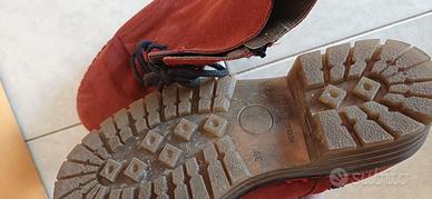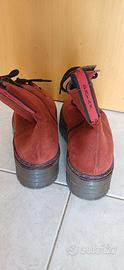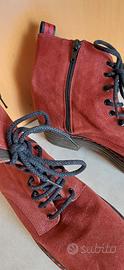 stivaletti stringati in suede rosso (o bordeaux) presentano caratteristiche distintive come la chiusura con lacci neri, una pratica zip laterale e una suola "chunky" con cuciture a contrasto