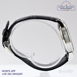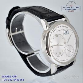 A. Lange & Söhne Lange 1 101.025 con data in platino 950, anno di produzione 2004, ghiera liscia in platino 950, vetro zaffiro antigraffio e antiriflesso, quadrante colore grigio ardesia con datario e riserva di carica, movimento meccanico a carica manuale, cinturino in alligatore opaco colore nero con fibbia in platino 950 originale A. Lange & Söhne.