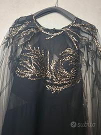 abito elegante oro e nero con tulle attaccato sulle spalle