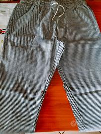 Pantalone da Cuoco classico, marca SIGGI, misura XL, colore a quadretto bianco e nero, 100% cotone, vestibilità regular, cintura a coulisse, due tasche anteriori e taschino posteriore.