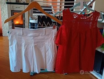 giacca a righe ,camicetta rossa,gonnellina bianca, camicetta verde,pantaloni a quadri,camicetta gialla,pantaloni con sfumature dorate,giretto bianco con schiena scoperta e bottoni.