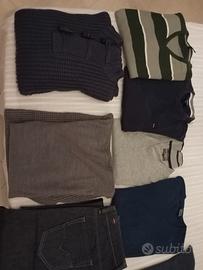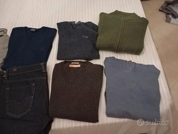 Vendo in blocco maglione collo a V taglia L,maglioncino Bench tagliaS,maglioncino grigio collo a V tagliaM,maglioncino blu collo a V taglia L felpa leggera tagliaM, maglione verde con cerniera taglia M, felpa celeste con cappuccio taglia L, maglioncino Rifle collo a V grigio scuro taglia L, sotto maglia grigia con ampio collo invernale ,maglione blu con bottoni a corno taglia M, jeans Diesel come da foto. I maglioncini con collo a V non sono mai stati usati . Il resto è stato indossato non più di 3/4 volte. I jeans Diesel da soli valgono praticamente più di tutto il lotto. Vendo in blocco a 30 euro causa inutilizzo.