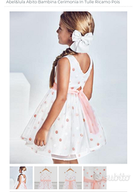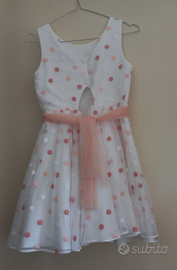 Abito Giromanica in tulle tinta unita con fascia, pois a fantasia ricamati di colore bianco e rosa. Tulle sulla gonna per donare maggiore volume.
