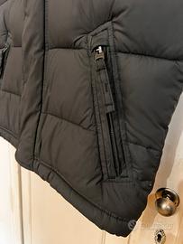 Piumino senza maniche con doppia zip anteriore, due tasche con zip, un taschino interno con zip e porta auricolari, taglia S ma comoda. Molto caldo.