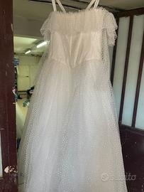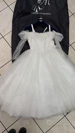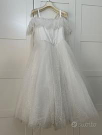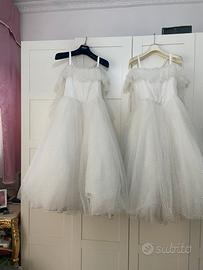 2 abiti da comunione in tulle glitterato in sera, compreso borsetta, per 9/10 anni. Altezza 1,28/ 1,29 Vita 43/44 dal lato sx al dx.